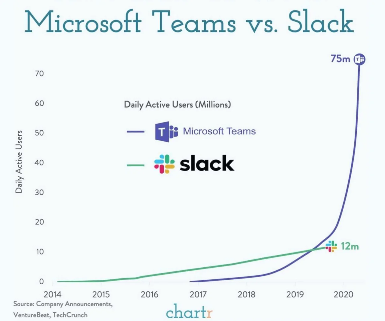 Teams competes with Slack, which came into existence in 2014, got to a million users in 18 months, was at 4 million users when Teams launched, and 12 million users when Teams hit 75 million.