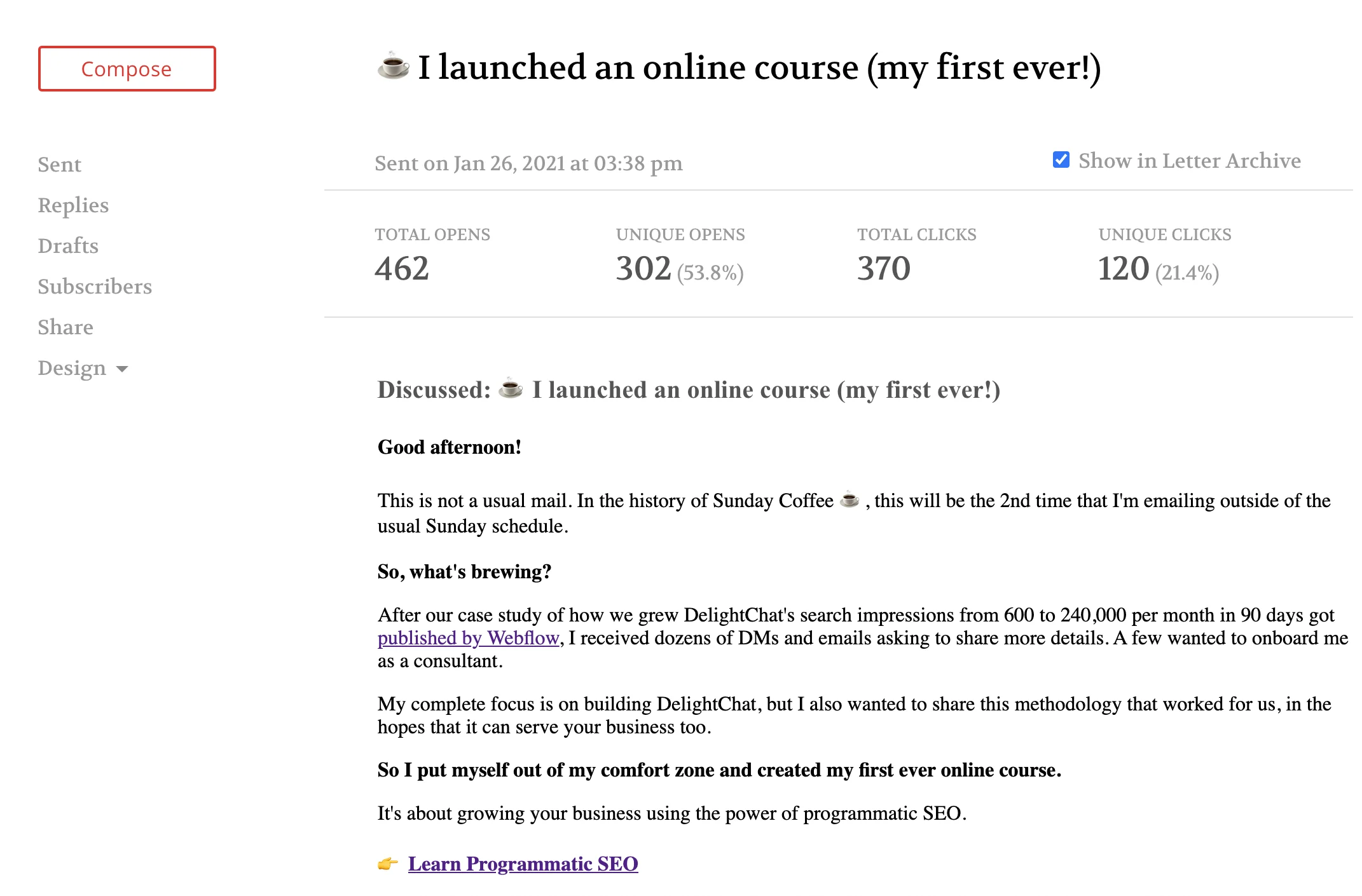 Because I never tried to ‘grow’ my newsletter, all the subscribers came in organically. As a result, my newsletter open rates are consistently >50%.