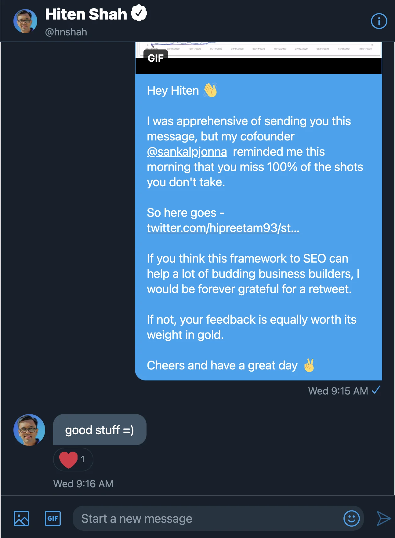 Important note: Don’t do this unless you’ve established credibility with someone. They are most likely to ignore you. That definitely happened with a few of the people I sent this DM to.