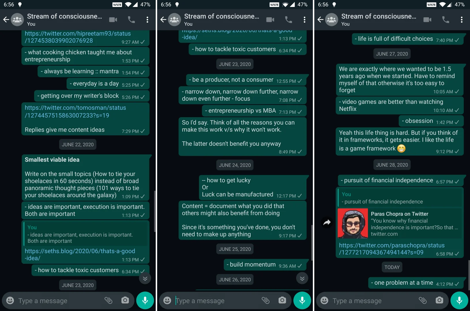 To counter that, every time I would have a thought - while browsing, talking to someone, whenever - that I want to write about, I’d drop it into a private WhatsApp group.