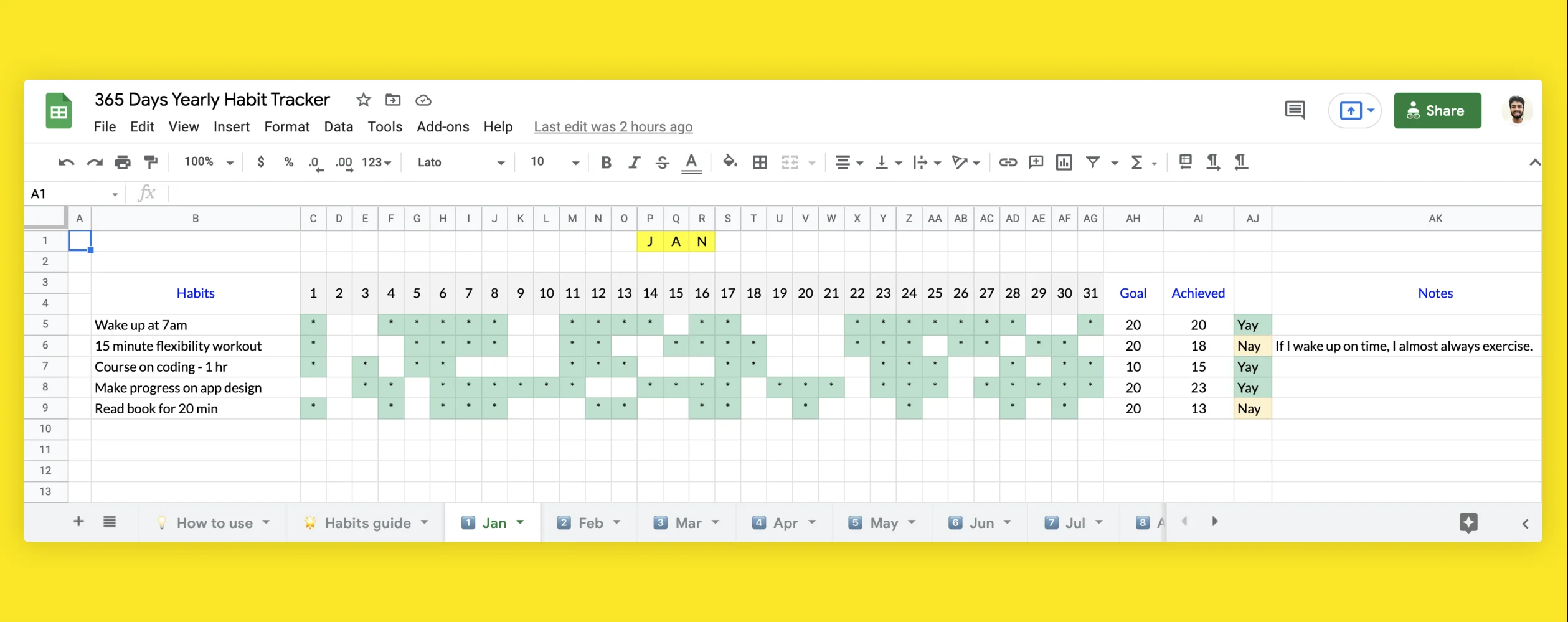 You can download the yearly habit tracker as an excel spreadsheet and use it locally, or make a copy and use it online using Google Sheets.