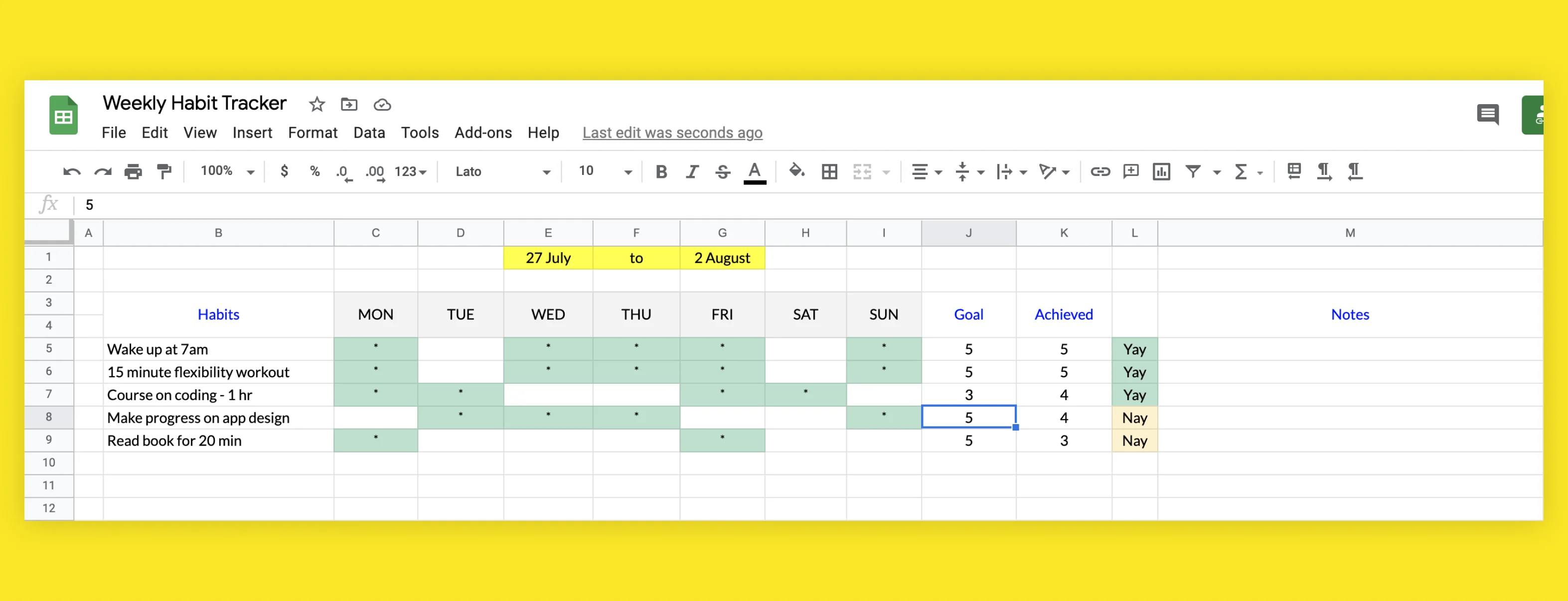 7 Day Weekly Habit Tracker Spreadsheet on Google Sheets