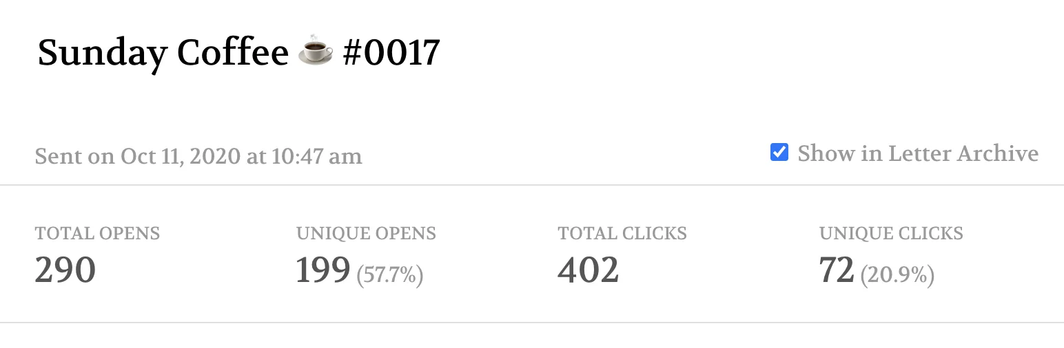 This weekly newsletter was sent to 378 subscribers. Last week's letter was sent to 346 subscribers and had a 57.7% open rate.